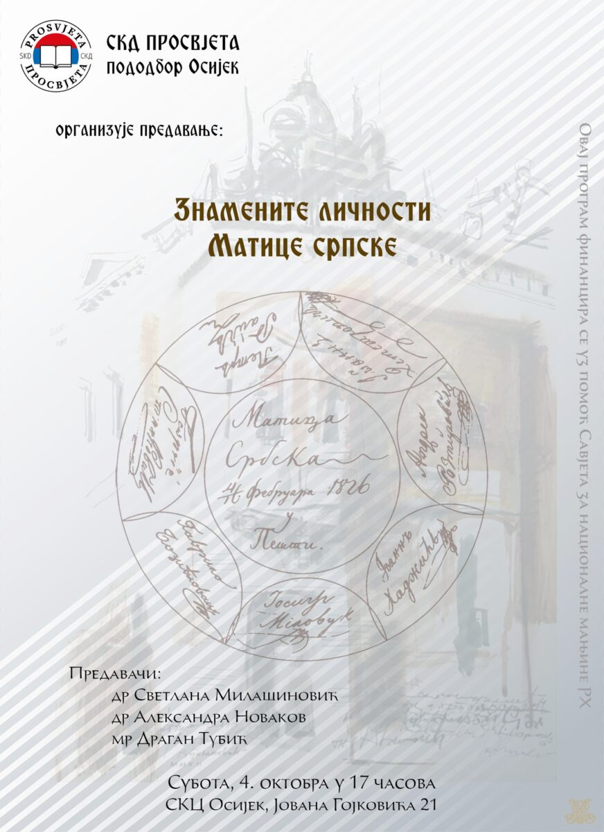 6. 10. 2025.U subotu je u Srpskom kulturnom centru u Osijeku održano predavanje „ Znamenite ličnosti Matice srpske“. Program je realiziran u organizaciji Matice srpske, u sklopu suradnje SKD „ Prosvjeta“ pododbor Osijek i Matice srpske iz Novog Sada.